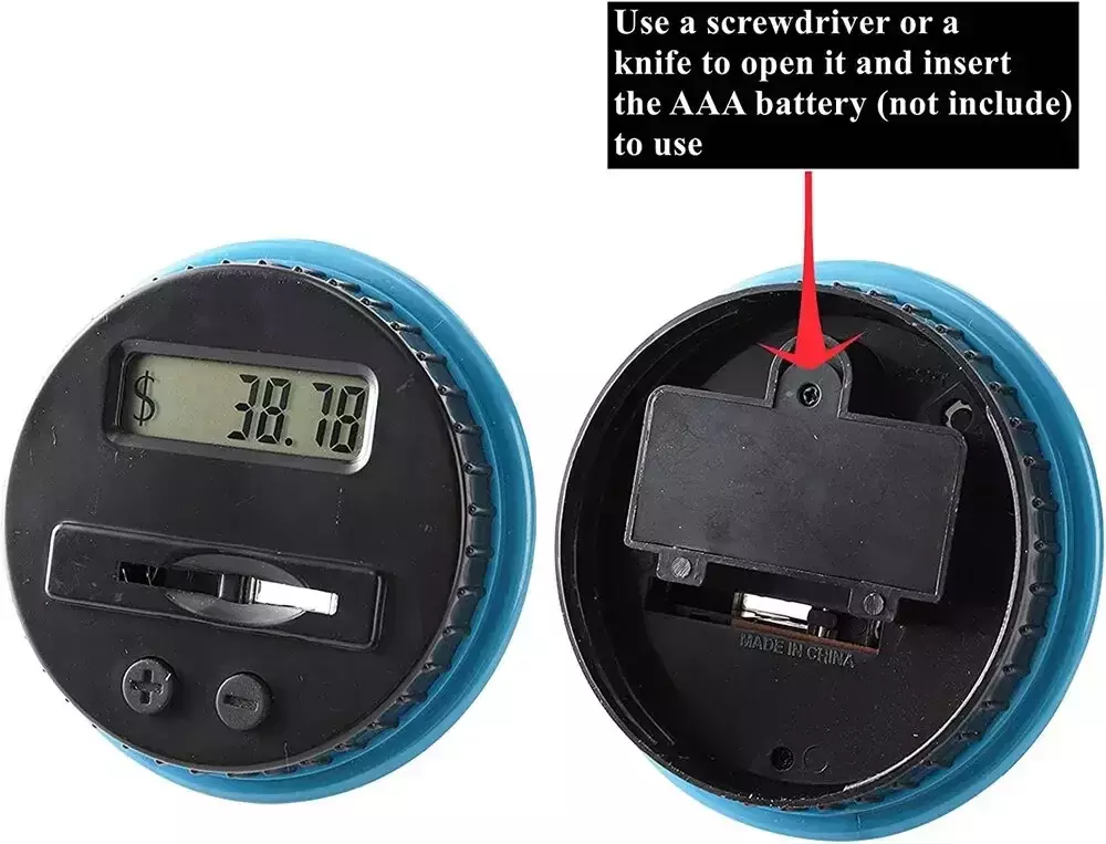 O cofrinho tem um tamanho de 4,5 x 7,9 polegadas e é alimentado por 2 pilhas AAA (não incluídas). Ele conta automaticamente cada moeda que você coloca, exibindo o valor total em tempo real na tela digital.